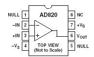 The AD820 is available in two performance grades. The A and B grades are rated over the industrial temperature range of −40°C to +85°C. The AD820 is offered in three 8-lead package options: plastic DIP (PDIP), surface mount (SOIC) and (MSOP).