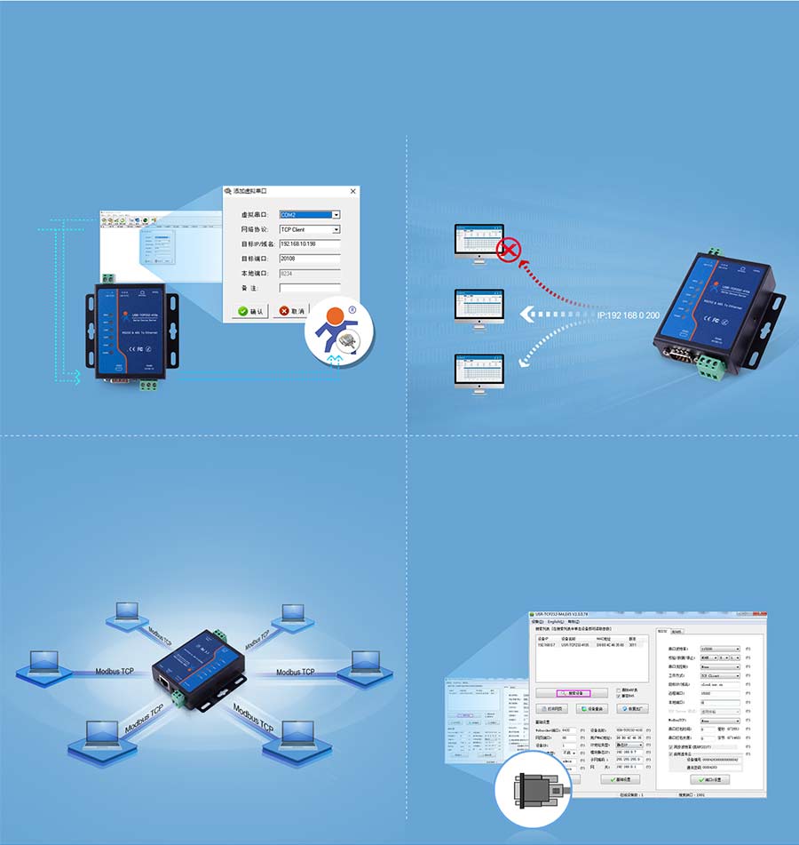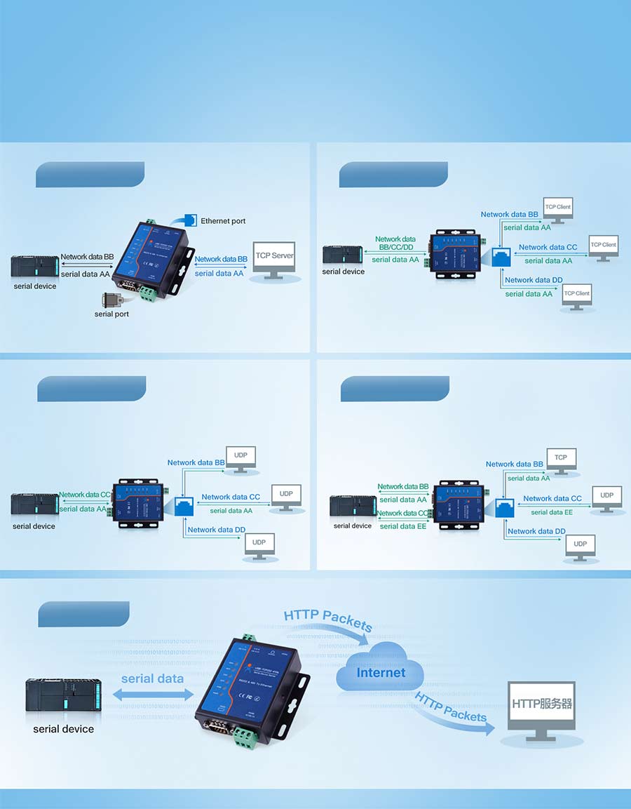 Modbus to Ethernet converters USR-TCP232-410S support 5 work modes: TCP Server, TCP Client, UDP Client, UDP Server and httpsD Client. Configure simply and it can realize data transmission.
